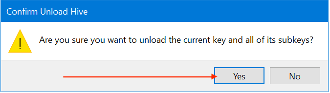 You will need to confirm if you want to unload the hive, click on Yes as shown below. That is all you need to correctly load and unload a Windows Registry hive.