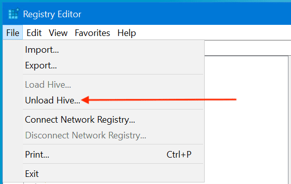 When done modifying, select the newly created node and in the menu select “File” then click on “Unload Hive” as shown below.