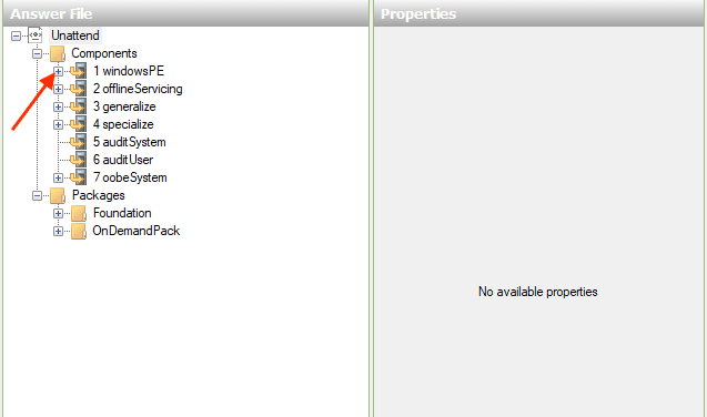 Next Under the Answer File, select the Dropdown the components folder, and expand Windows PE