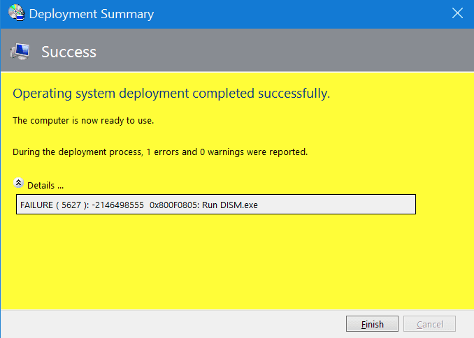Why was the error “0x800f0805, run DISM executable (Failure 5627)” prompted?
