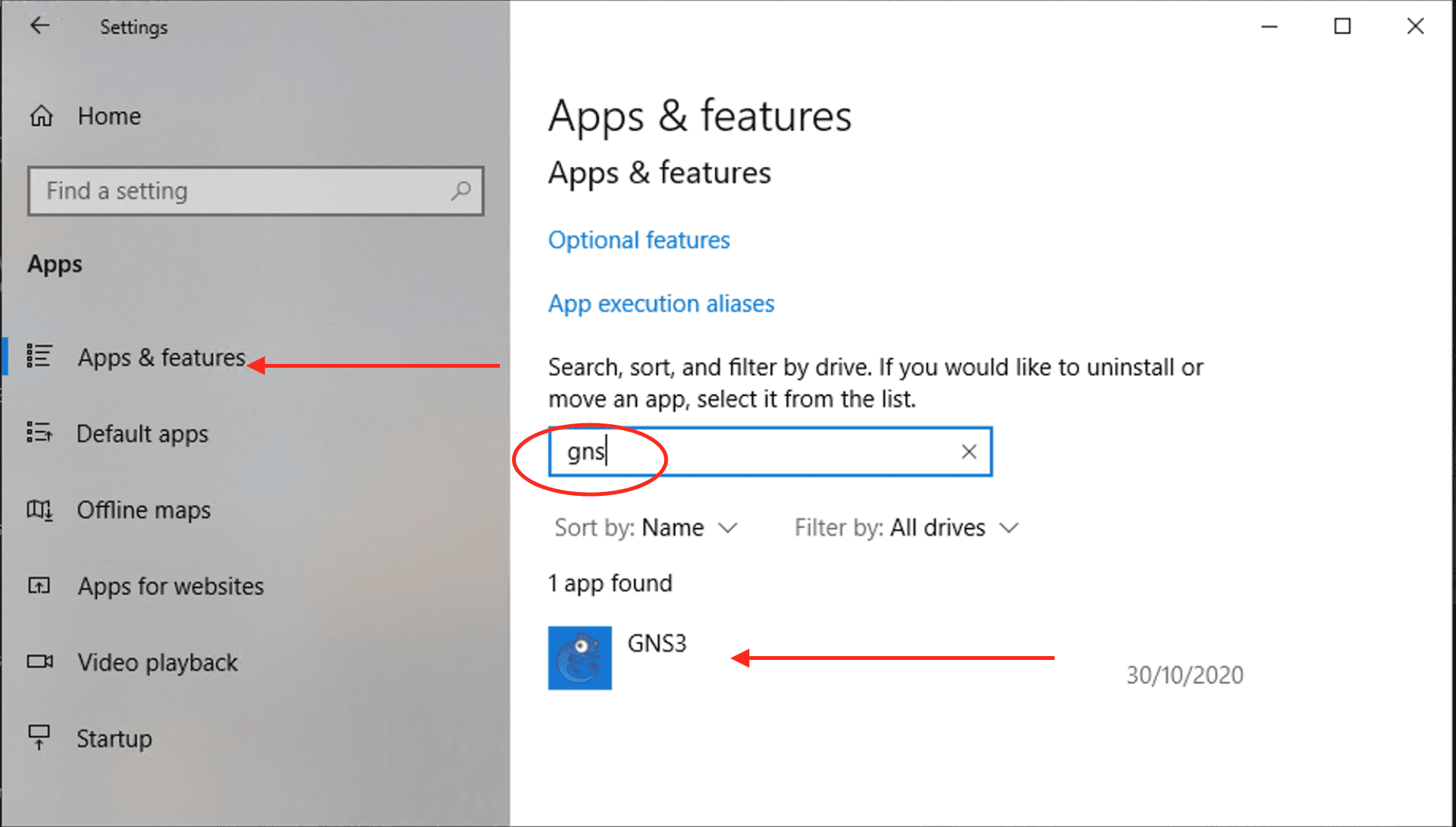 Next, search for GNS3 in the list of installed programs and click on it.
