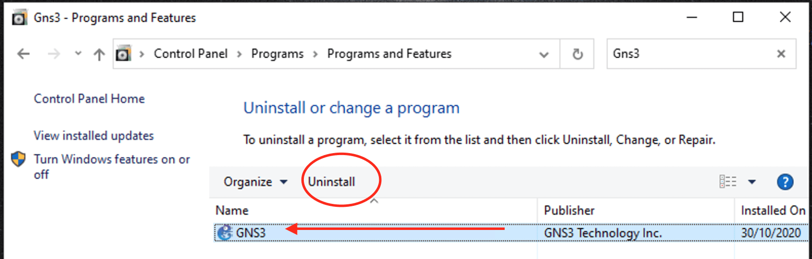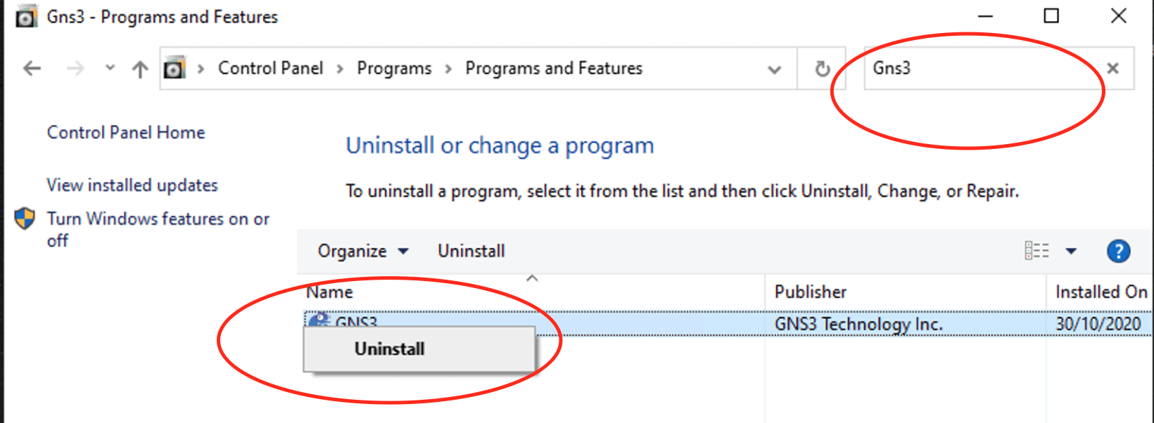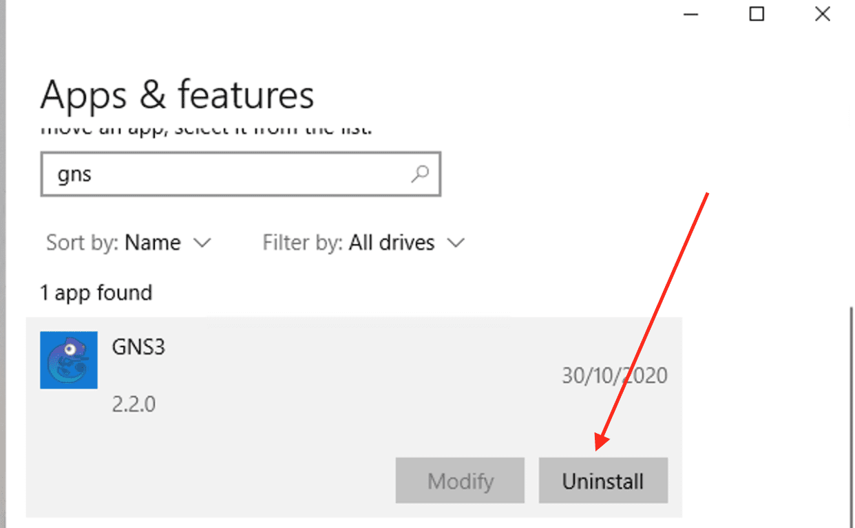 You can also right click on the program and then select uninstall as shown below. This will ensure GNS3 is uninstalled.
