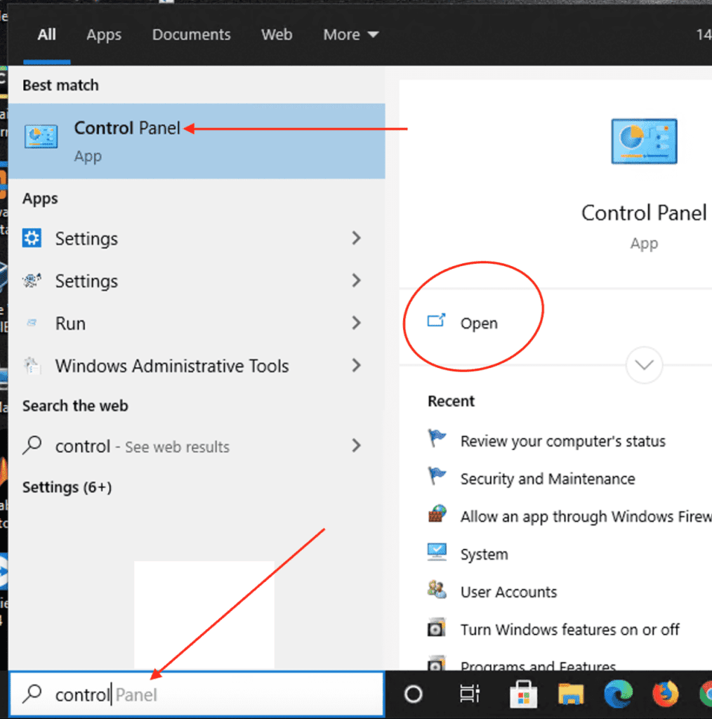 2: Control Panel: Search for Windows Control Panel as shown below