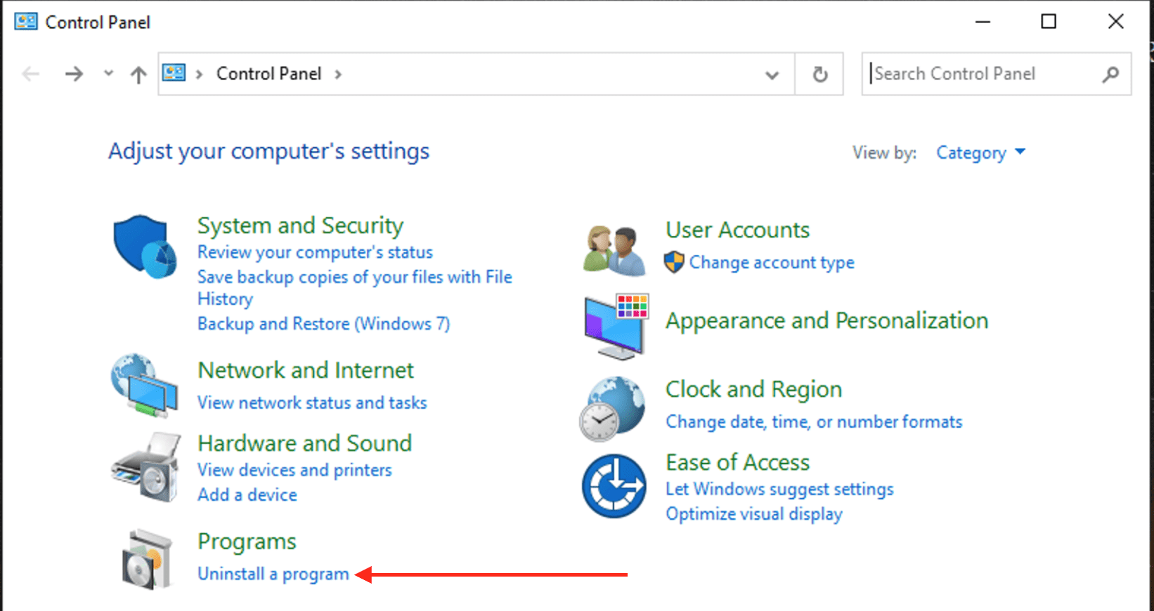 This will open up the “Control Panel” Window. Click on Program or “uninstall a program” as shown in the figure below.