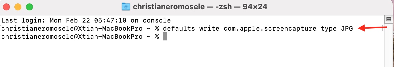 Regardless of your approach, this will open the terminal as shown below. To change default screen capture format, please run the following command below followed by your desired file format “JPG, TIFF, GIF, PDF, and PNG”.