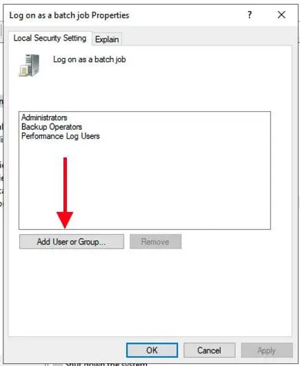 This will open up the Log on as a batch job Properties window. Click on Add Users or Group as shown below.