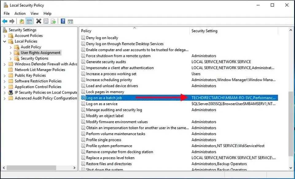 Locate the Local Policies, and then click User Rights Assignment. On the right pane of the window, double-click on log on as a batch job