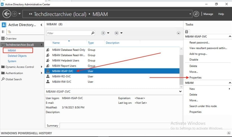 – Moreover, Find the app pool credentials (in my case a service account named MBAM-IISAP-SVC),