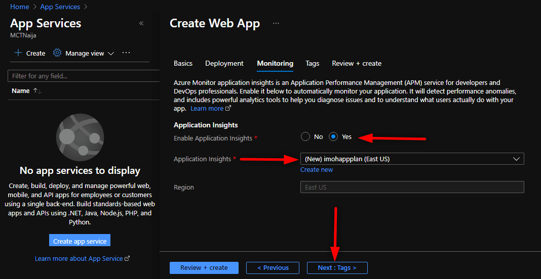 Moreover, The above screenshot shows the Application Insights is set to enable and the Region set to East US, which is the selected Region for the app service plan. In addition, You can go ahead and add Tags , which is optional, but adding tags will enable you to organize your Azure resources and management hierarchy. Nonetheless, Learn more about tags. I am going to skip adding tags and head to the Review + create button.