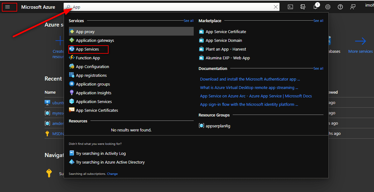 App Servicein the horizontal search bar across the portal interface or click theshow portal menuas highlighted in the screenshot below;