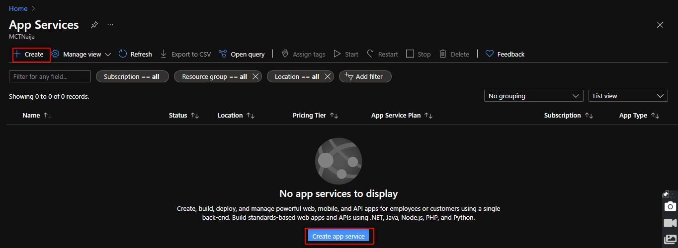 3. Click + Create or Create app service. The screenshot below clearly shows this