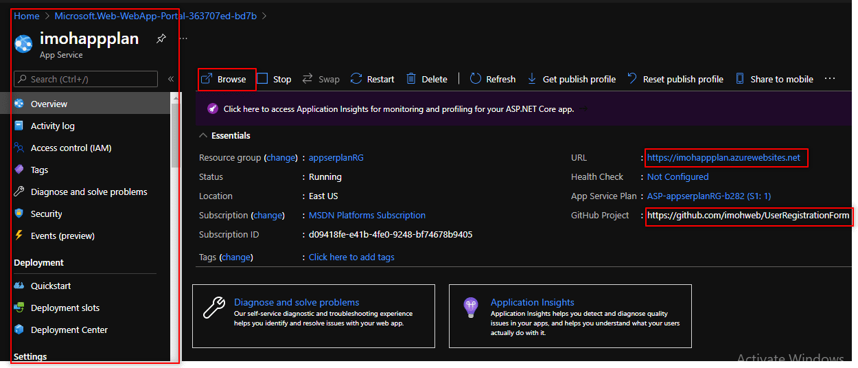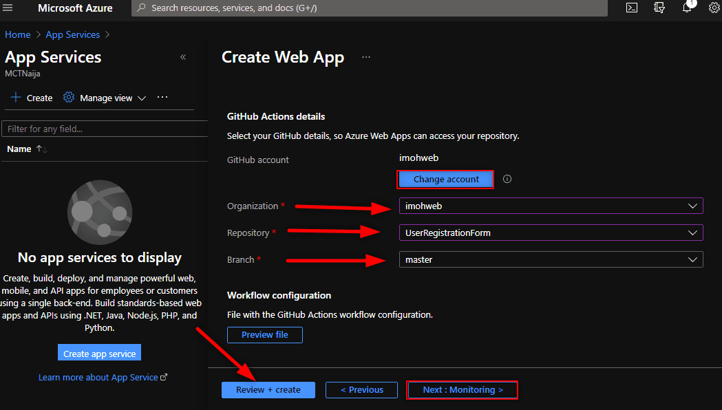 Consequently, The above screenshot shows the GitHub actions details page. As clearly shown, the name of my GitHub organization is imohweb, the GitHub repository where my code is located UserRegistrationForm , while the branch is master. Similarly, You can go ahead and configure the monitoring solution to enable Azure Monitor application insights which is an Application Performance Management (APM) service for developers and DevOps professionals. Nevertheless, See the related article to learn more about Azure Monitor Application Insights. See the below screenshot for more info!