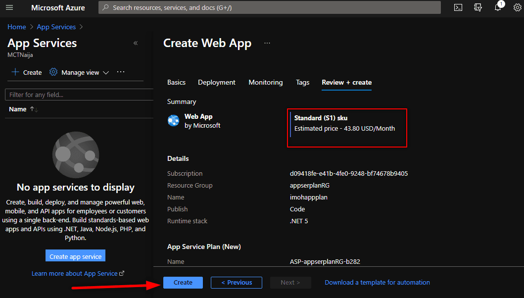 In addition, The screenshot above will take you to where to explore more app service pricing tiers. Nonetheless, Feel free to compare and choose the one suitable for your app and click apply to retain the chosen plan. Consequently, I left mine at S1 the app service plan and the Production Pricing Tier. Similarly, The Dev/Test app service pricing tier can be used for non-production workloads alone.