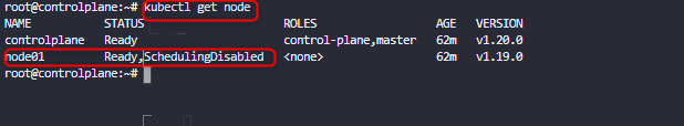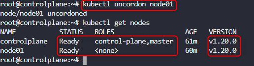 If we inspect the nodes using kubectl get nodes. We will see that both the control plane and worker node are having upraded version of 1.20.0. But the worked node is still disabled. So we need to uncordon the worker node