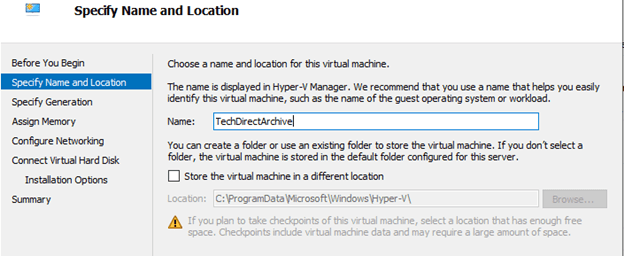 2. Specify the name of the Virtual Machine and select where you want the location of the VM whether default or changing it to your preferred location.