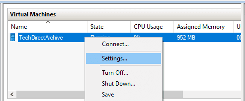 1: Now go to Hyper-V Manager and confirm where the Window Server VM files is located by right-clicking on the VM and selecting settings