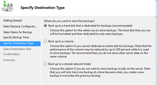 8. It is necessary you know the destination of your VM backup, in case of any disaster recovery incident. You can back up to a dedicated hard disk, to a volume or to a shared network folder. For the purpose of this guide, we will be backing up to a dedicated hard disk.