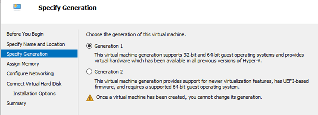 3. Specify the generation you want to configure whether Generation 1 that supports both 32-bit and 64-bit operating system and also support previous versions of Hyper-V or Generation 2 that only support 64-bit operating system and newer versions of Hyper-V.