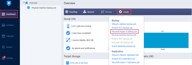 13. After downloading and installing NAKIVO, create a Microsoft Hyper-V backup job by clicking Create on the Dashboard and then clicking Microsoft Hyper-V backup job from the drop-down list.