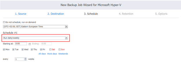 17. Next you need to configure the Job Schedule. Make use of the Schedule drop-down list. In the drop-down list, you will find the Run daily/weekly, Run monthly/yearly, Run periodically, and Run after another job. Considering your environment, you can select the kind of job schedule that fits you.
