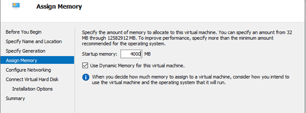 4. Specify the size of memory you want for the virtual machine. The default memory is usually 1024MB, it is recommended to have enough memory for an improved VM performance. You can either set up a static memory or dynamic memory for the VM.