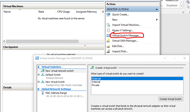 5. You can go to the Virtual Switch Manager to create a virtual switch and you link your system network adapter to it.