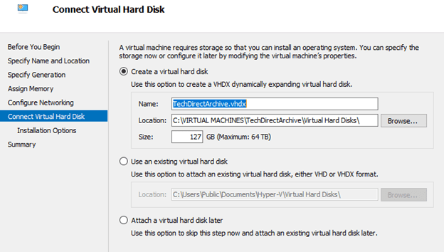 6. Connect your Virtual Hard Disk. You can either create a virtual hard disk, Use an existing virtual hard disk or Attach a virtual hard disk later.