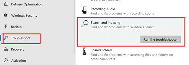 - By the right side click on Search and indexing and click the Run the troubleshooter underneath.