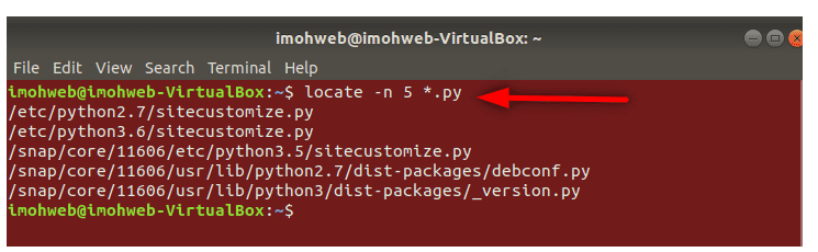 To limit the search results for the sake of readability, use the -n (dash N flag) option followed by the number of results you want to display. The following command will search for all .py files and display only 5 results: