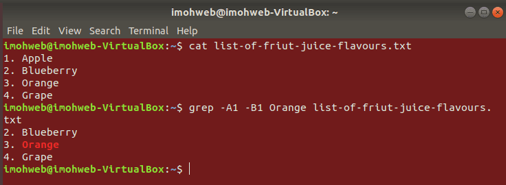Lastly, the –A and –B i.e. grep –A1 –B1 Orange friut-juice-flavours.txt can be combined into one single source to print a number of lines after and before matching the search pattern as shown below: