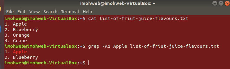 For example, consider the text file titled “list-of-fruit-juice-flavors” i.e. by running the cat fruit-juice-flavours.txt (Apple, Blueberry, Orange and Grape). To see the flavor that finish one ranking below the “Apple” fruit juice flavor. Run the command: