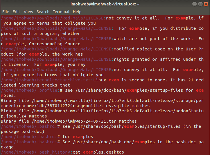 The grep –r can be used to search for a pattern recursively within the directory. This is especially useful when you don’t know which file contains the specific pattern that you are looking for. In this example we’re printing all files that contain the string exam in /home/imohweb directory. We run: