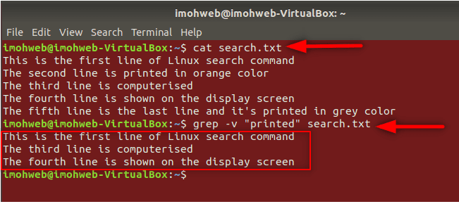 This option lists all lines that do not contain the particular string or pattern you search for. In this case the second and the fifth line contain the string printed it’s not printed to the output screen. Refer to the output screen below: