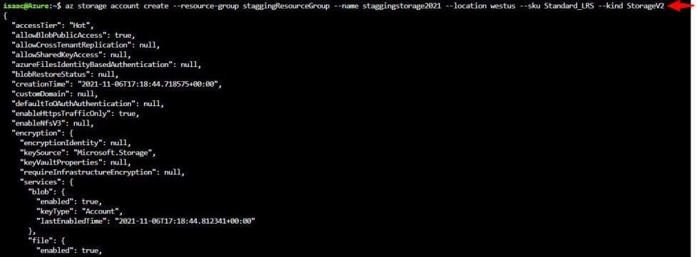az storage account create --resource-group staggingResourceGroup --name staggingstorage2021 --location westus --sku Standard_LRS --kind StorageV2