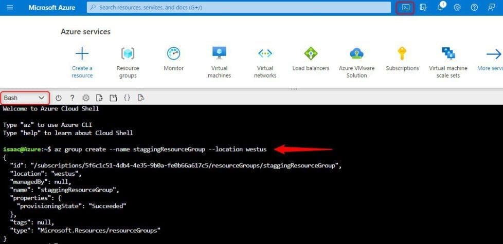 Go to the Azure Portal. At the top bar, click on the cloud shell, and Select to open the bash terminal