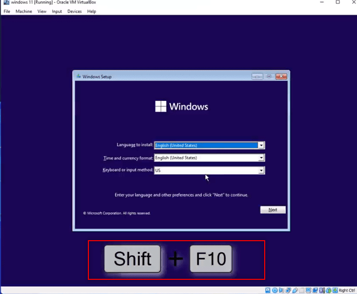 To solve this, start the Virtual Machine again. You should see a screen looking like the one we have before. But at this stage, press Shift + F10 as shown below. This will bring up the following Command Prompt (cmd) screen.