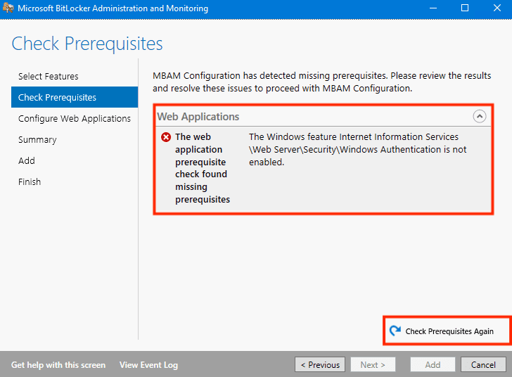 While configuring MBAM, you might encounter the error: “Web application ‘Administration Portal’ can’t enable due to unmet software dependencies.” Incorrectly installing MBAM occurred due to not meeting the specified prerequisites accurately.
