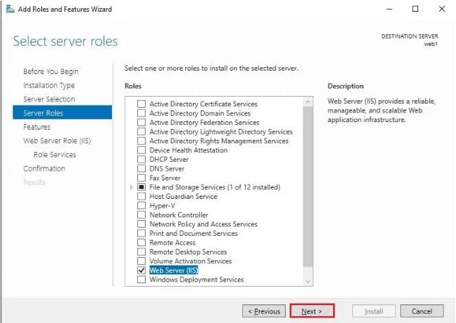 From the Select server roles tab, select the checkbox next to Web Server (IIS).