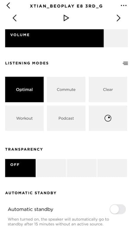 The free Bang & Olufsen app for iOS and Android has further configuration options. Below are the screenshots from my Bang&Olufsen iOS app. You can control playback here. The equalizer provides five presets from “Work-out” (less highs) to “Podcast” (less bass), which you can tweak and save on a matrix. You can also control the transparency mode, and this works with different intensities, with the music automatically pausing at the highest level.