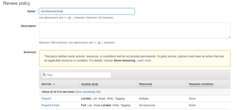 - Thus, on the Review Policy section, enter a name for the policy and click on Create policy.