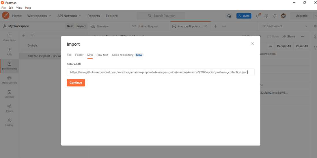 On the Import window, Select Link, and then enter the following in the URL: https://raw.githubusercontent.com/awsdocs/amazon-pinpoint-developer-guide/master/Amazon%20Pinpoint.postman_collection.json.