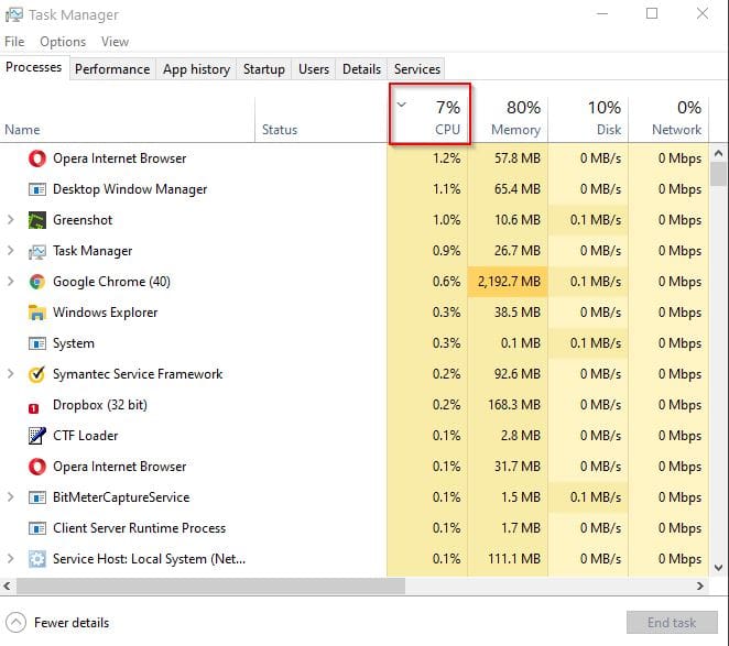 2) Click the CPU column header to sort the processes by CPU usage. Now you can check which processes eat up your CPU.