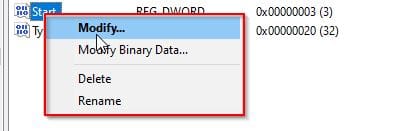 3. On the right side of the pane, right-click Start entry, then select Modify!