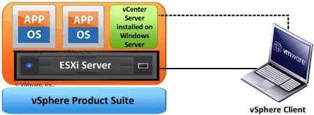 The diagram above shows the vSphere suite in a more descriptive way. vSphere is a product suite, ESXi is a hypervisor installed on a physical machine. vSphere Client HTML5 is used to access ESXi Server to create and manage virtual machines on the ESXi server. vCenter Server is installed as a virtual machine on top of the ESXi server, it can also be Linux based virtual machine (or virtual appliance). vCenter server can also be installed on different standalone physical servers, but why not virtualize it too right?