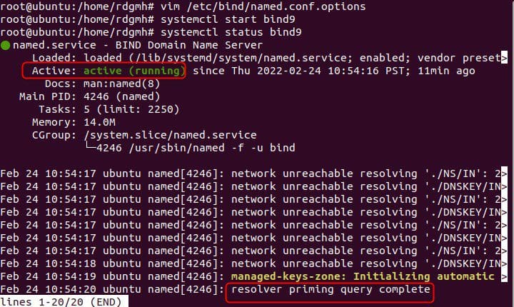 install the named server: #apt install bind9 configure the Domain Name server for local caching #vim /etc/bind/named.conf start the Domain Name Server #systemctl start bind9 Test #systemctl status bind9