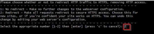 The next step will prompt you to inform Certbot of which domains you would like to activate HTTPS for. The listed domain names are automatically obtained from your Apache virtual host configuration, that’s why it’s important to make sure you have the correct ServerName and ServerAlias settings set up and configured in your virtual host. If you would like to enable HTTPS for all listed domain names (recommended), you can leave the prompt blank and proceed by pressing ENTER. Otherwise, select the domains you want to enable HTTPS for by listing each appropriate number, separated by commas or spaces, then press ENTER