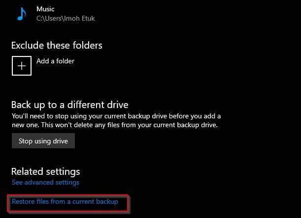 Step 1 – Go to Update & Security > Backup from the Settings app. Choose to Restore files from a previous backup.