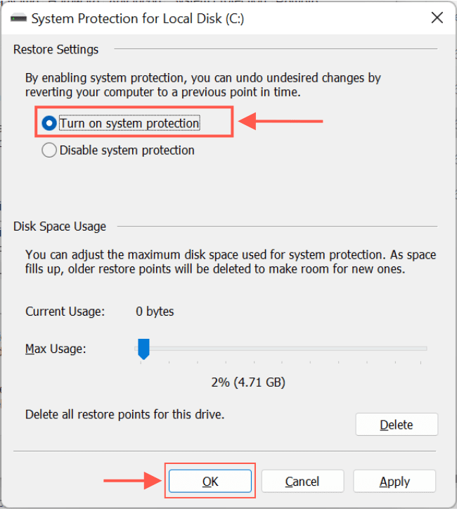 Turn on system protection in the System Protection for Windows dialog box. If your drive space is small, you may want to reduce the amount of space used for system protection.