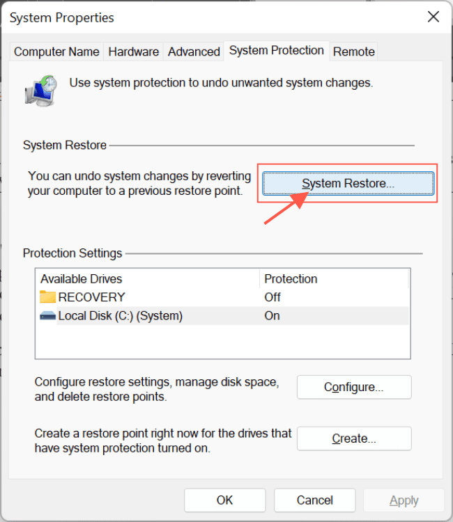 To perform a System Restore, navigate to System Properties and the System Protection tab. Click on the feature to launch the System Restore Wizard.