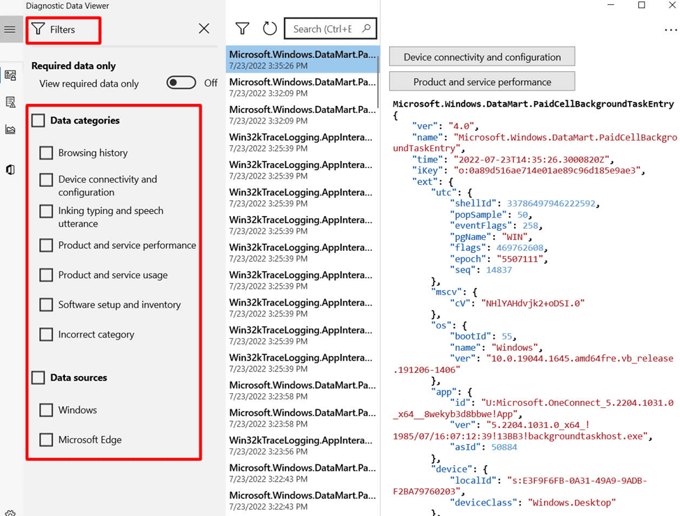 Note: Diagnostic Data Viewer stores a history of diagnostic data sent by your Windows device. Events are removed starting with the oldest once either the storage size or storage time capacity is reached.